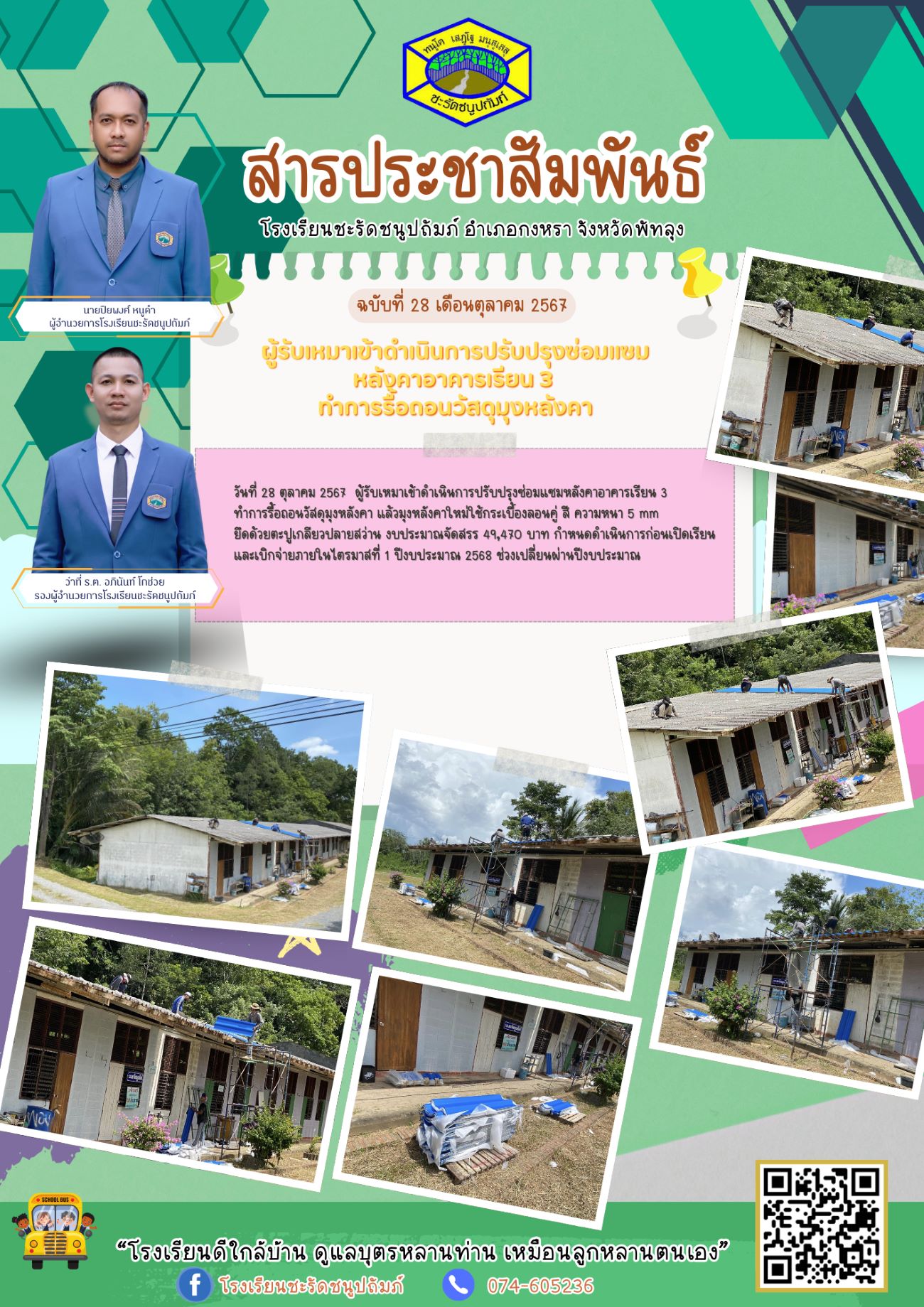 ผู้รับเหมาเข้าดำเนินการปรับปรุงซ่อมแซมหลังคาอาคารเรียน 3 ทำการรื้อถอนวัสดุมุงหลังคา แล้วมุงหลังคาใหม่ใช้กระเบื้องลอนคู่ สี