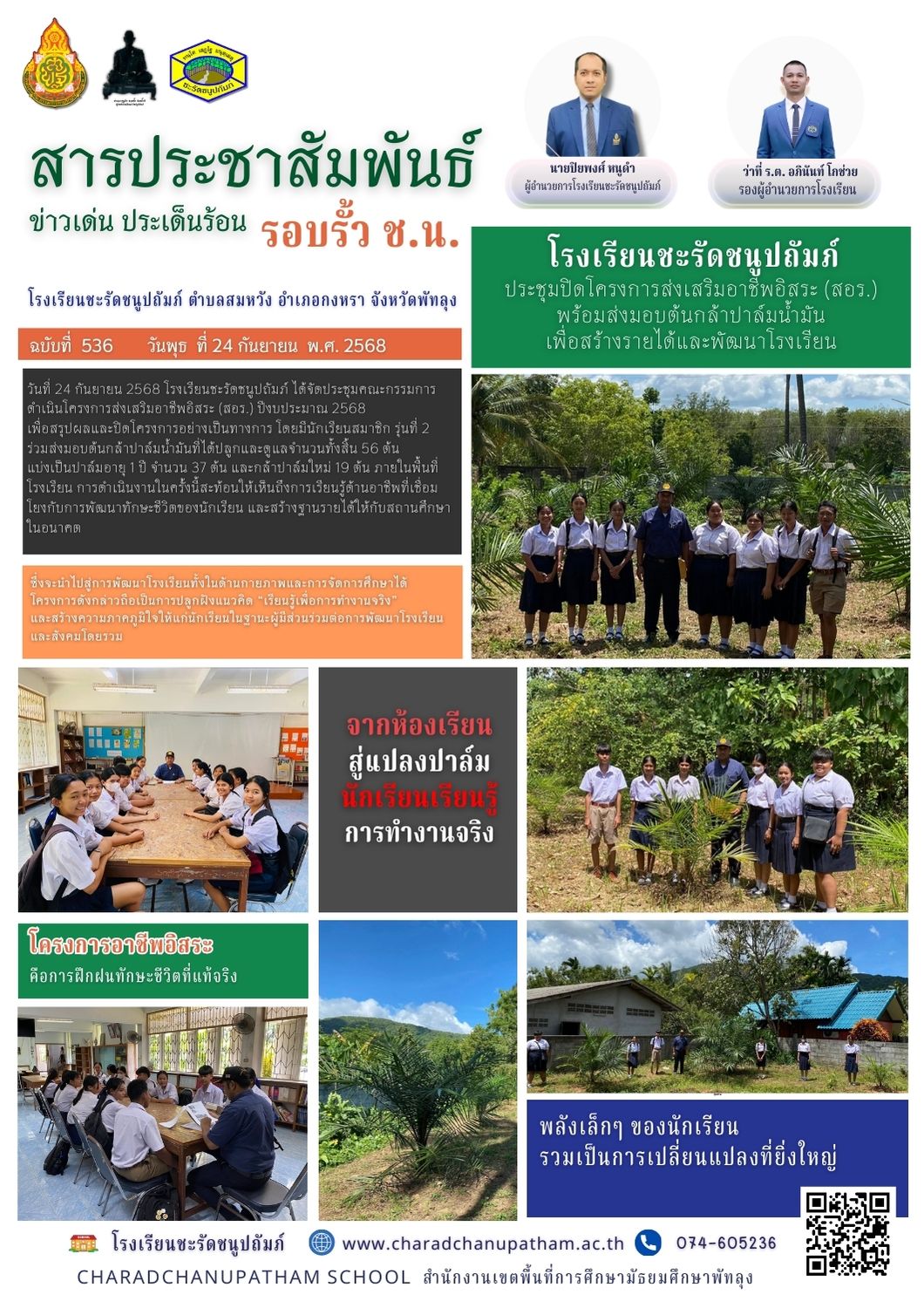 โรงเรียนชะรัดชนูปถัมภ์ ประชุมปิดโครงการส่งเสริมอาชีพอิสระ (สอร.) พร้อมส่งมอบต้นกล้าปาล์มน้ำมัน เพื่อสร้างรายได้และพัฒนาโรงเรียน
