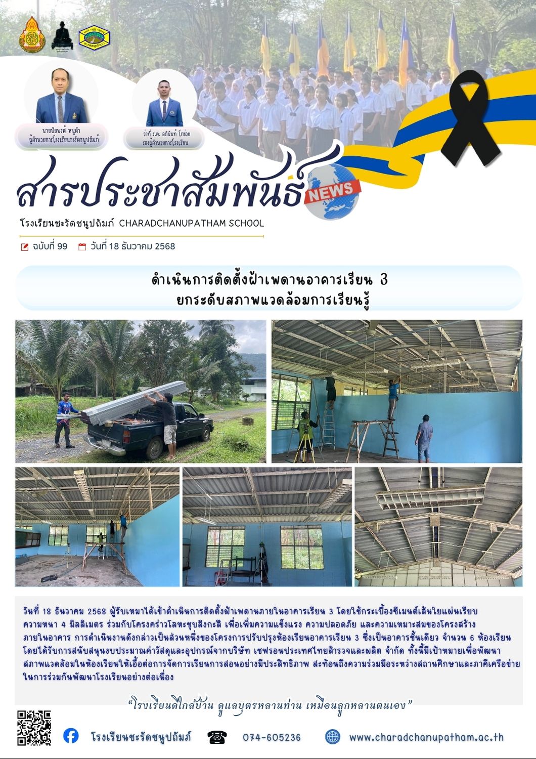 ดำเนินการติดตั้งฝ้าเพดานอาคารเรียน 3 ยกระดับสภาพแวดล้อมการเรียนรู้
