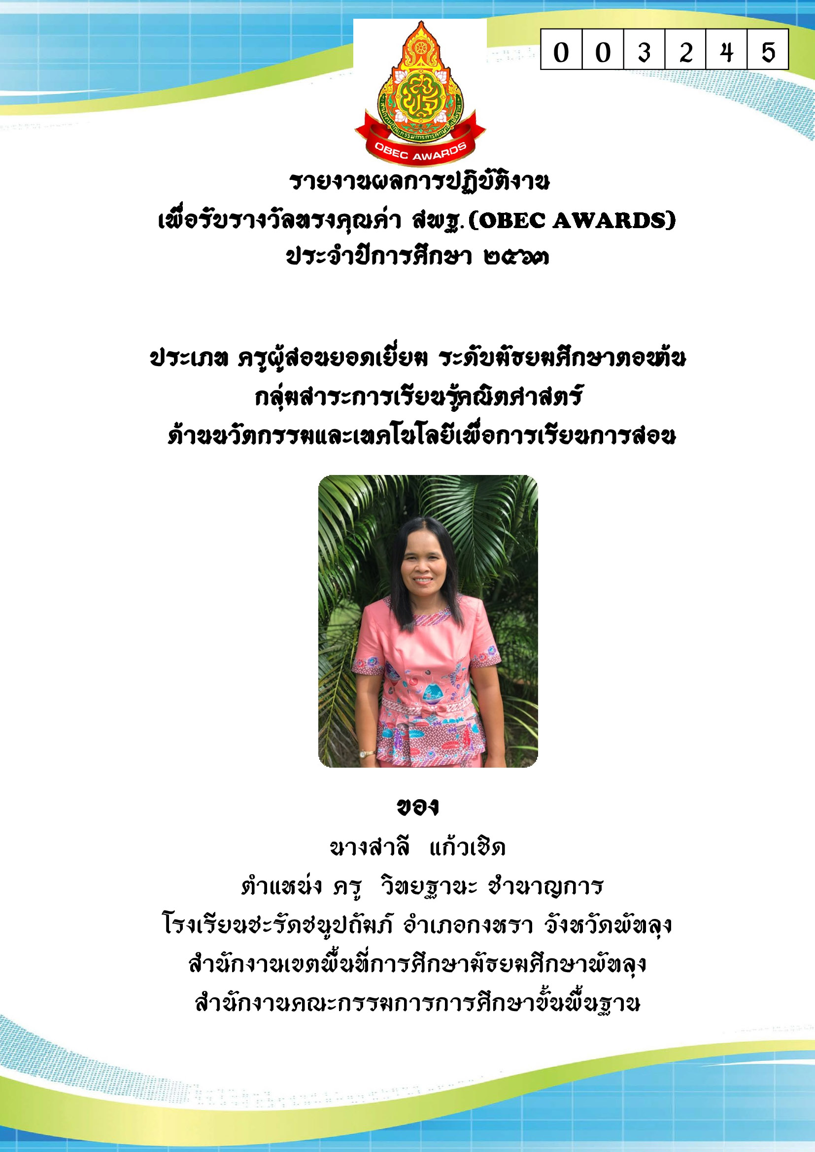 ชื่อผลงาน : ครูผู้สอนยอดเยี่ยม ระดับมัธยมศึกษาตอนต้น กลุ่มสาระการเรียนรู้คณิตศาสตร์ ด้านนวัตกรรมและเทคโนโลยีเพื่อการเรียนการสอน