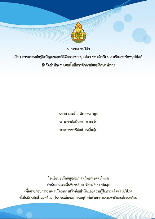 ชื่อผลงาน : รายงานวิจัย เรื่อง การตระหนักรู้ถึงปัญหาและวิธีจัดการขยะมูลฝอย ของนักเรียนโรงเรียนชะรัดชนูปถัมภ์ สังกัดสำนักงานเขตพื้นที่การศึกษามัธยมศึกษาพัทลุง